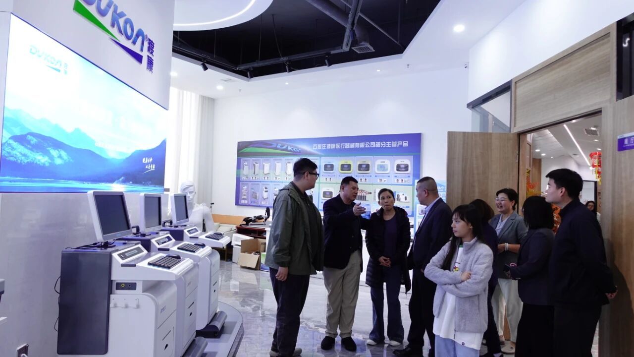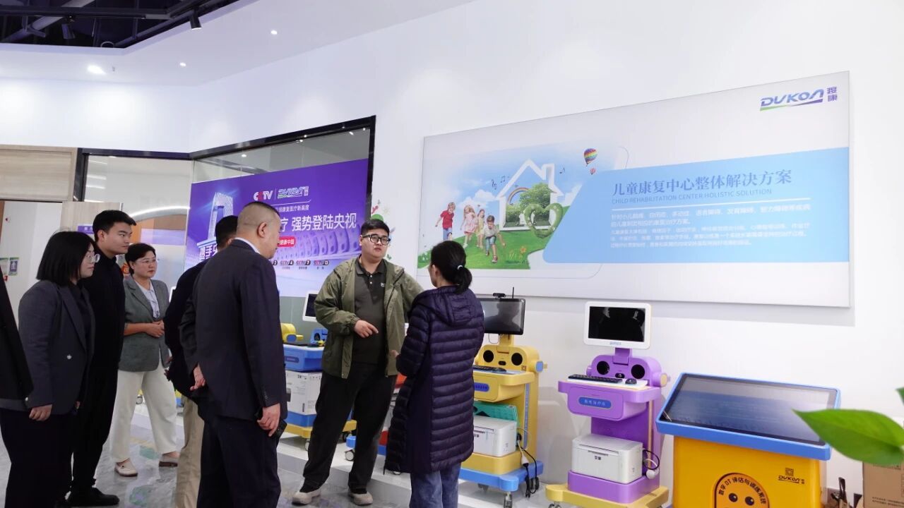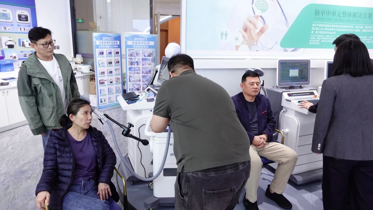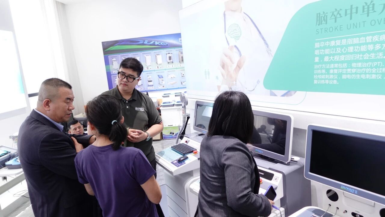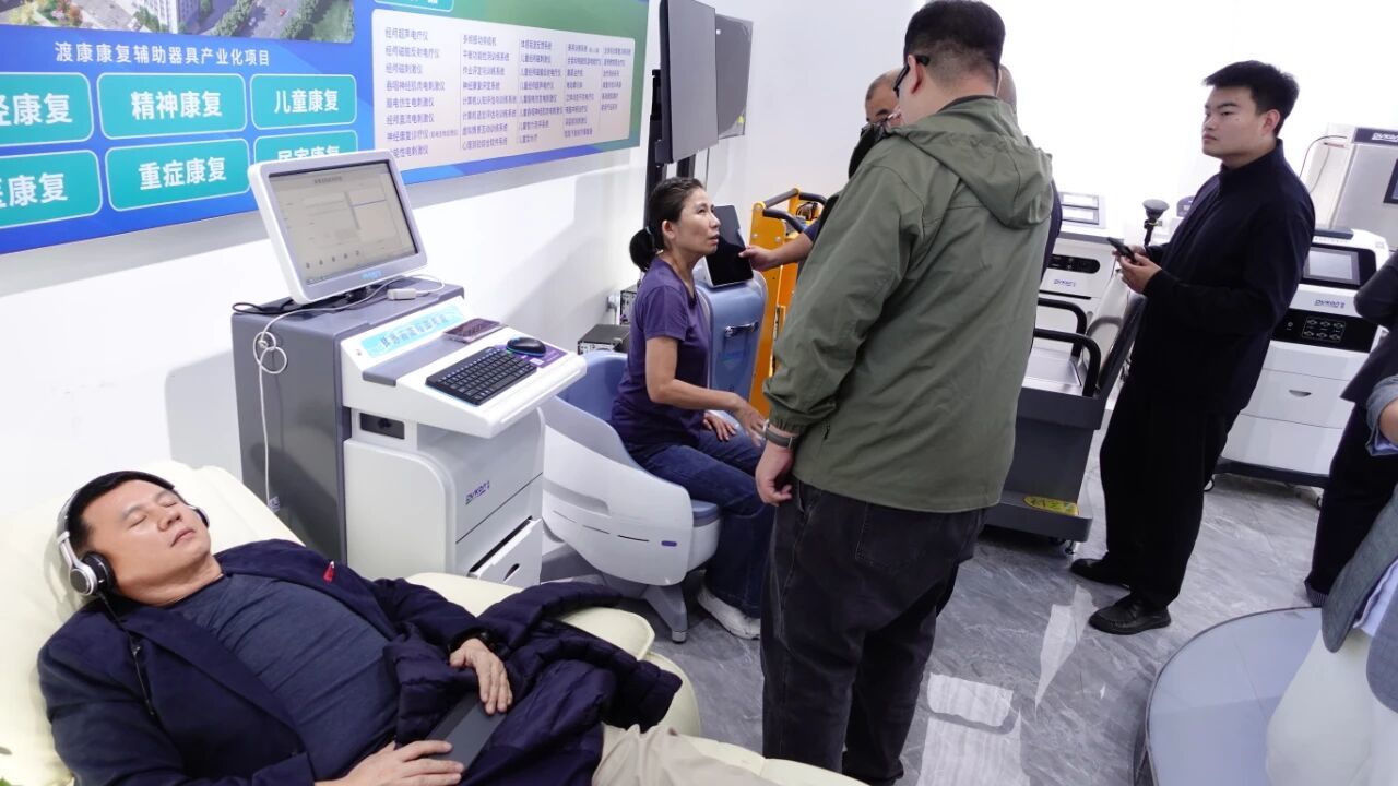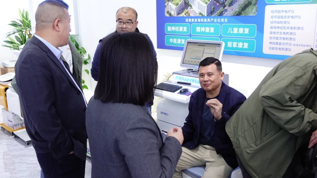 在渡康科技化展廳,副總經(jīng)理李智超帶領(lǐng)來(lái)賓全面了解企業(yè)發(fā)展歷程、科研體系與創(chuàng)新成果。展廳內(nèi)一系列高端設(shè)備展示出渡康在腦神經(jīng)康復(fù)、精神康復(fù)、兒童康復(fù)、中醫(yī)康復(fù)、居家康復(fù)及重癥康復(fù)六大單元的綜合實(shí)力。李智超介紹道,渡康的創(chuàng)新源自于對(duì)生命的敬畏與責(zé)任的堅(jiān)守。渡康自主研發(fā)的重復(fù)經(jīng)顱磁刺激儀(rTMS)、經(jīng)顱直流電刺激儀(tDCS)、經(jīng)顱超聲電療儀(TUS)等無(wú)創(chuàng)腦神經(jīng)調(diào)控技術(shù)系列設(shè)備,以其安全、精準(zhǔn)、智能的技術(shù)優(yōu)勢(shì),正為全球患者提供更多康復(fù)希望。